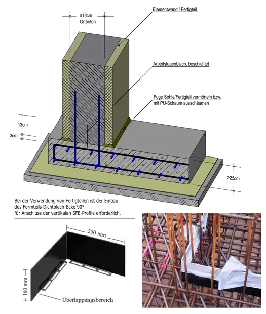 Ausbildung der Weißen Wanne über Elementwände / Dreifachwände Abdichtung Sohle/Wand Elementwand